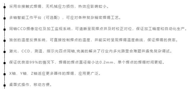 激光焊接由實(shí)時(shí)溫度反饋系統(tǒng)、CCD同軸定位系統(tǒng)和半導(dǎo)體激光器組成;配備自主開(kāi)發(fā)的智能軟釬焊軟件,支持各種格式文件的引入。原有的PID在線溫度調(diào)節(jié)反饋系統(tǒng)可以有效控制恒溫焊接,保證焊接的良品率和精度。它具有廣泛的應(yīng)用范圍,可用于在線生產(chǎn)或獨(dú)立加工。它具有以下特點(diǎn)和優(yōu)點(diǎn):