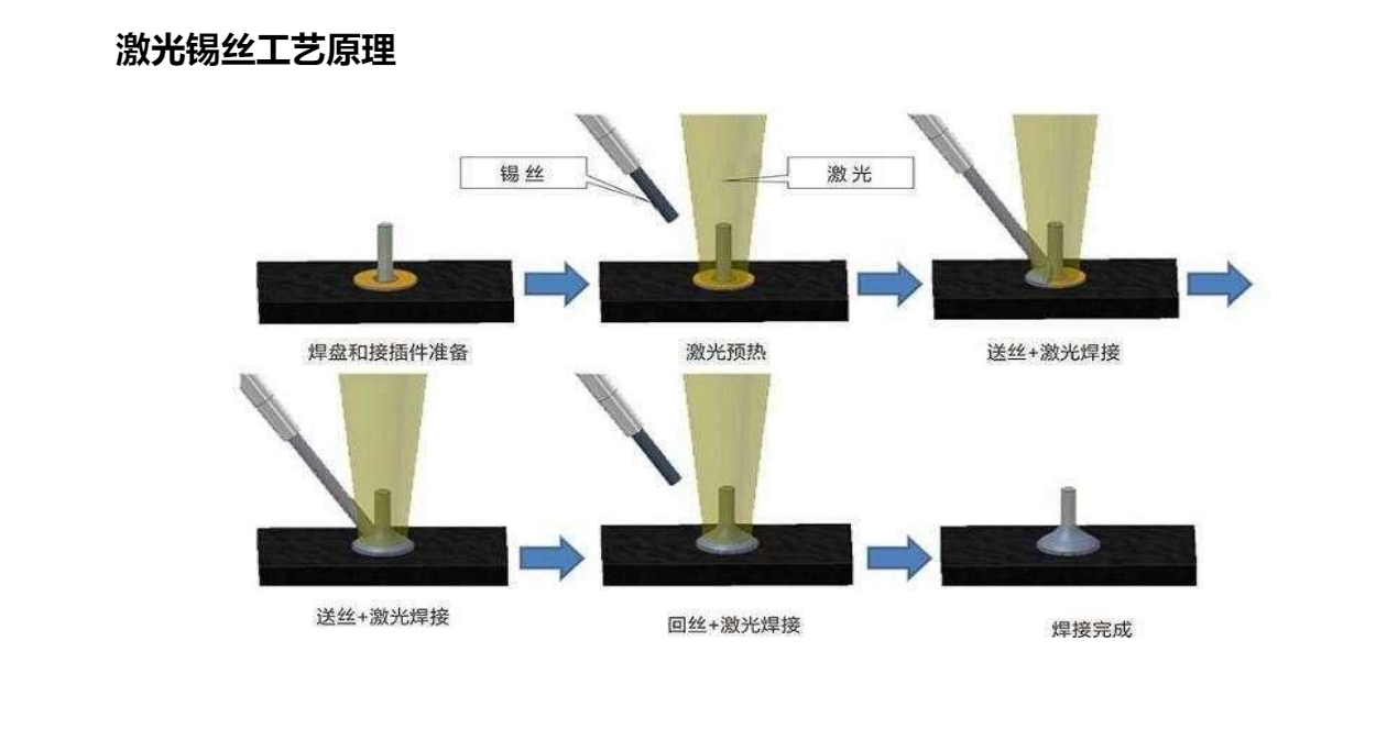 與激光錫膏焊接不同,激光錫絲焊接有一個送絲過程。焊接過程開始前,需要對產(chǎn)品焊盤進(jìn)行預(yù)熱,然后將錫合金或純錫制成的焊絲通過自動送絲系統(tǒng)送至焊盤位置,用激光束照射,熔化焊絲,與焊接材料連接。
