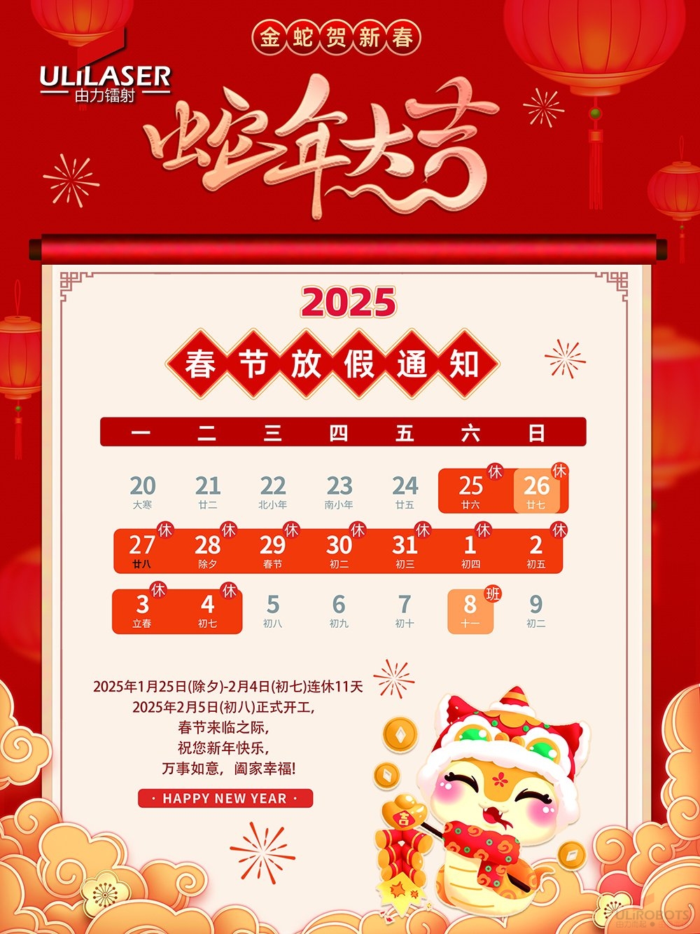 新春佳節(jié)漸進(jìn),為歡度中華民族的傳統(tǒng)佳節(jié),使全體人民能夠開(kāi)開(kāi)心心地過(guò)上一個(gè)歡樂(lè)、祥和的2025年春節(jié),盡可能的與家人一起享受節(jié)日的歡樂(lè)和喜悅,結(jié)合公司生產(chǎn)實(shí)際情況,經(jīng)公司領(lǐng)導(dǎo)研究決定: