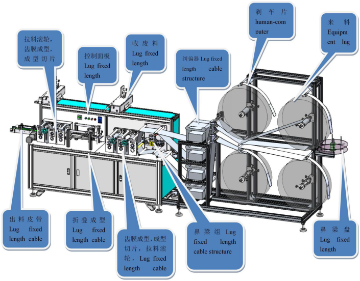 Casting machine → equipment carrier → welding ear rope → folding ear rope → shaping ear rope → discharging of masks → stacking assembly line of masks