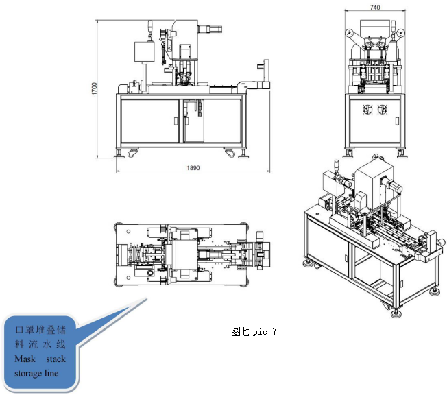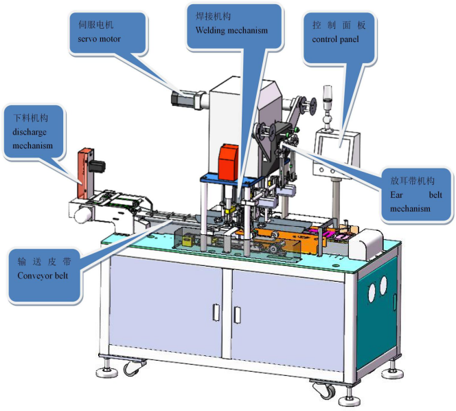 Material feeding → welding → discharging of masks → stacking assembly line of masks