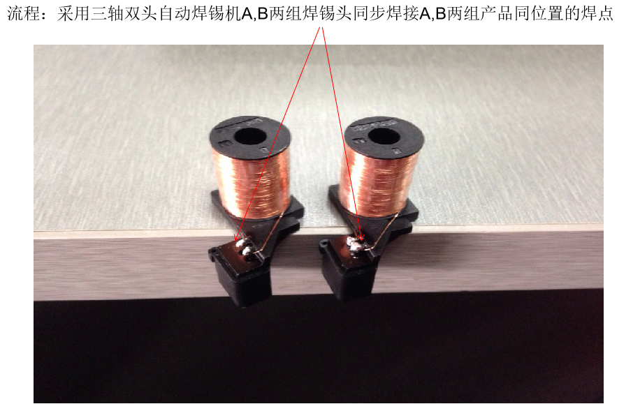 一個產(chǎn)品共計2個焊點,分為A&B兩組產(chǎn)品。由同一設備的A&B兩組焊錫頭對應A,B兩組產(chǎn)品同位置的焊點配合同時工作;